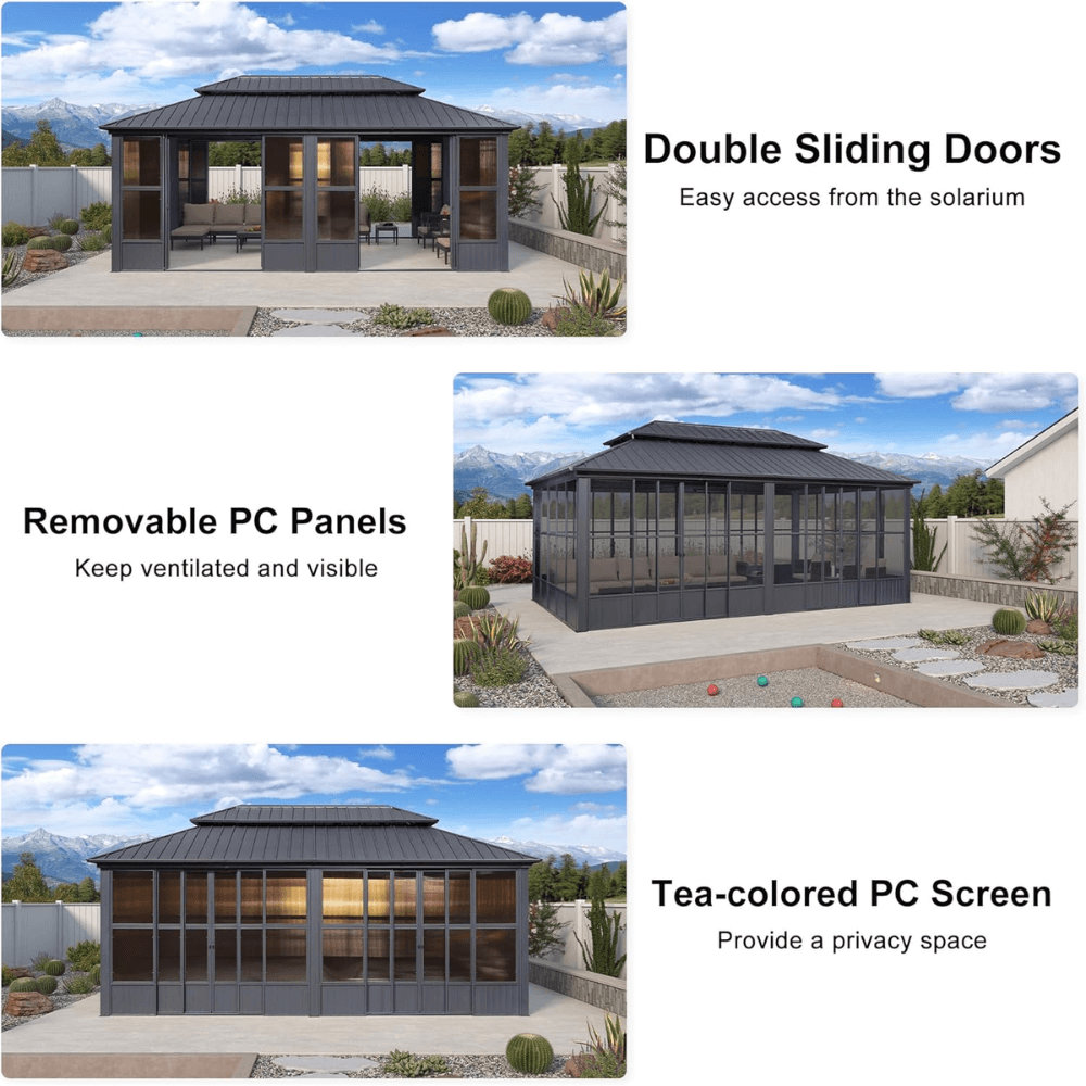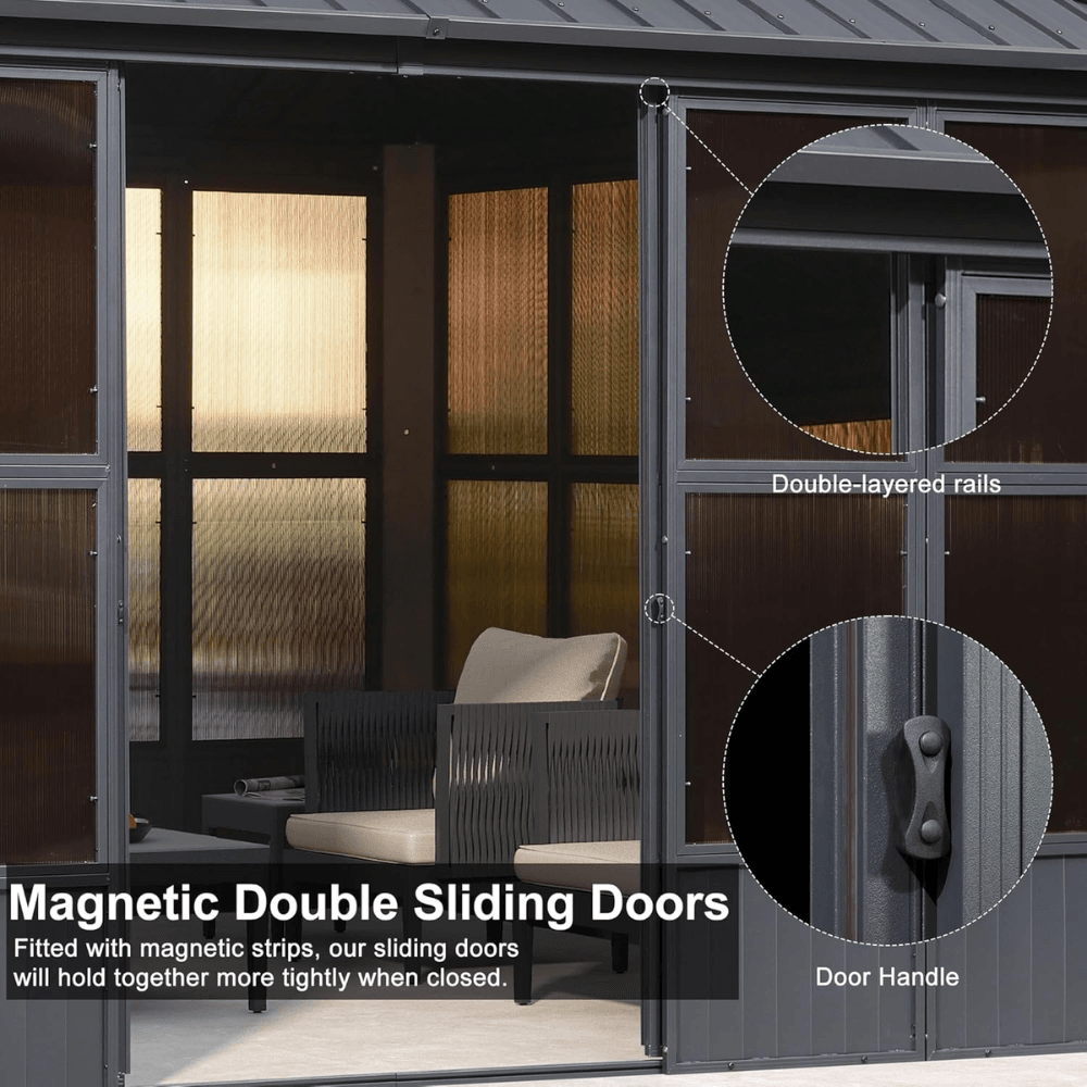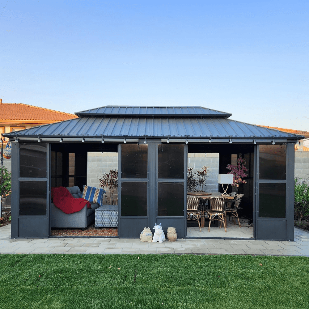 12ft.x16ft. Sunroom Hardtop Gazebo Solarium Galvanized Steel Double Roof Aluminum PC Mesh Screen House for Backyard